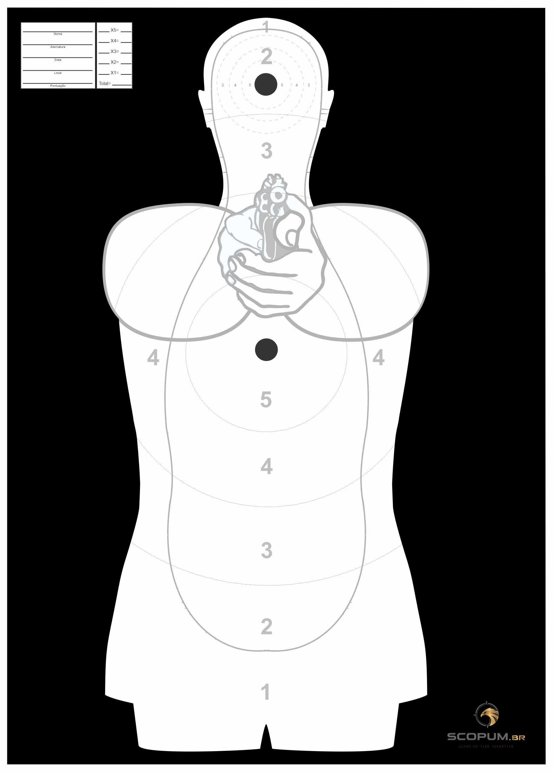 fabricante e distribuidora de Alvo Silhueta Humana e Alvo 4 cores, modelos oficial padrão SAT – ANP – PF para emissão de laudos de capacitação técnica exigidos pelo DPF. Medida Oficial conforme Portaria Nº 7508/2017 - 48x66 cm. Confeccionado em papel grosso - 220 gr. Atende não somente os esportistas, mas também as forças de segurança do nosso país, ou seja, ela sabe o que faz. Foi desenvolvido especialmente para que você possa treinar seus disparos de forma mais eficiente. Esse alvo é comumente utilizado em provas para porte de arma. Facilita a visualização do disparo a longa distância. Funcionam em armas de qualquer calibre.